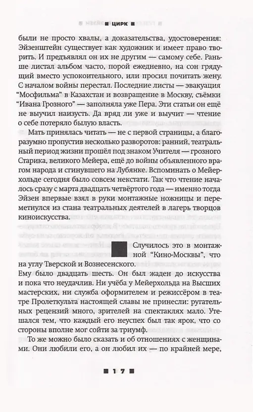 Гузель Яхина придумывает свой монтаж и называет книгу «роман-буфф». В ней название каждой главы отсылает к какому-нибудь фильму — «Жертвоприношение», «Персона», «Покаяние», — но не к картинам Эйзенштейна. А эпиграф каждой главы подобран из стихов Дзиги Вертова, который в романе выступает для Эйзена в роли «злостного неприятеля, извечного поединщика и обвинителя в плагиате». Уже своим устройством роман как будто дразнит героя, про которого не устает напоминать, как болезненно завидовал он другим, как мечтал о всемирной славе.