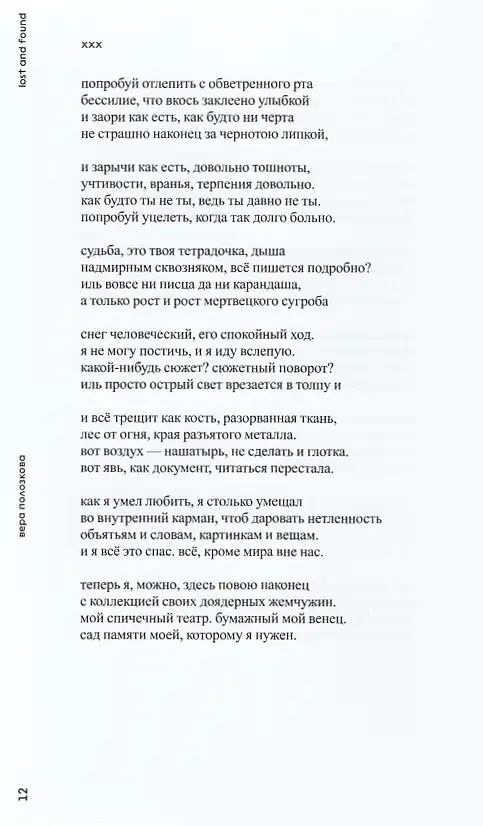 Вера Полозкова пишет так, как умеет только она: с высоким температурным режимом строки, с прерывистым дыханием, с резкими переходами от почти молитвенного регистра к разговорному, от катастрофы — к упрямой нежности, от ярости — к колыбельной. Здесь много пепла, снега, вокзалов, границ, сирен, разбитого быта, но не меньше — света, детского смеха, моря, сада памяти, тела, которое еще живо, и речи, которая еще способна спасать.