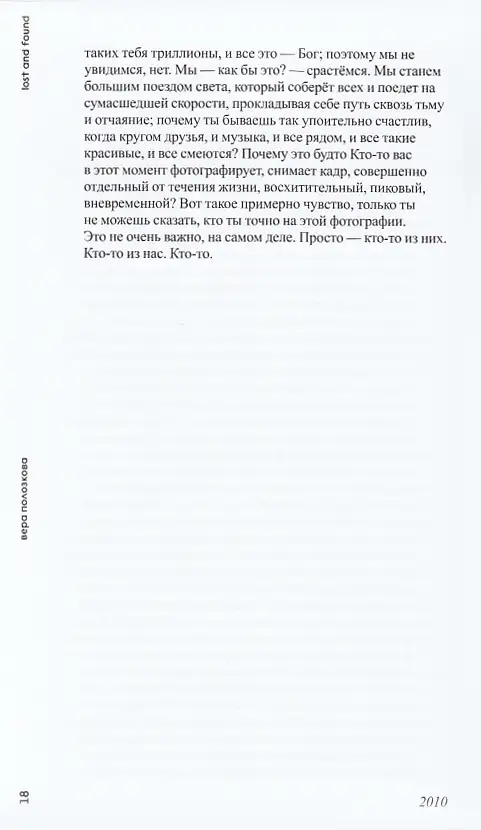 Lost and found — это бесконечное путешествие в утешении своих читателей и близких, рассеянных по миру. Большая часть фотографий в книге сделана Верой в эти же годы.