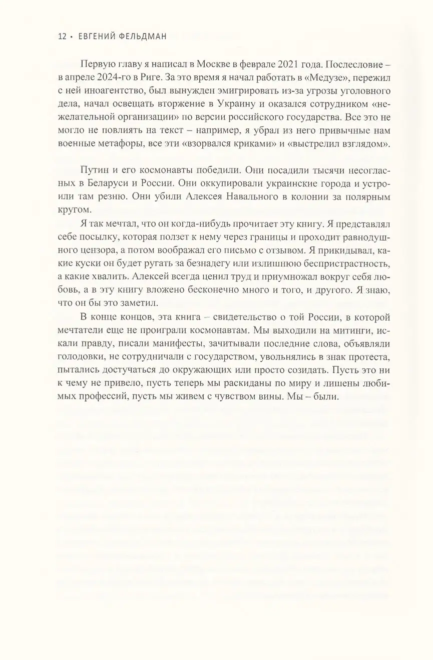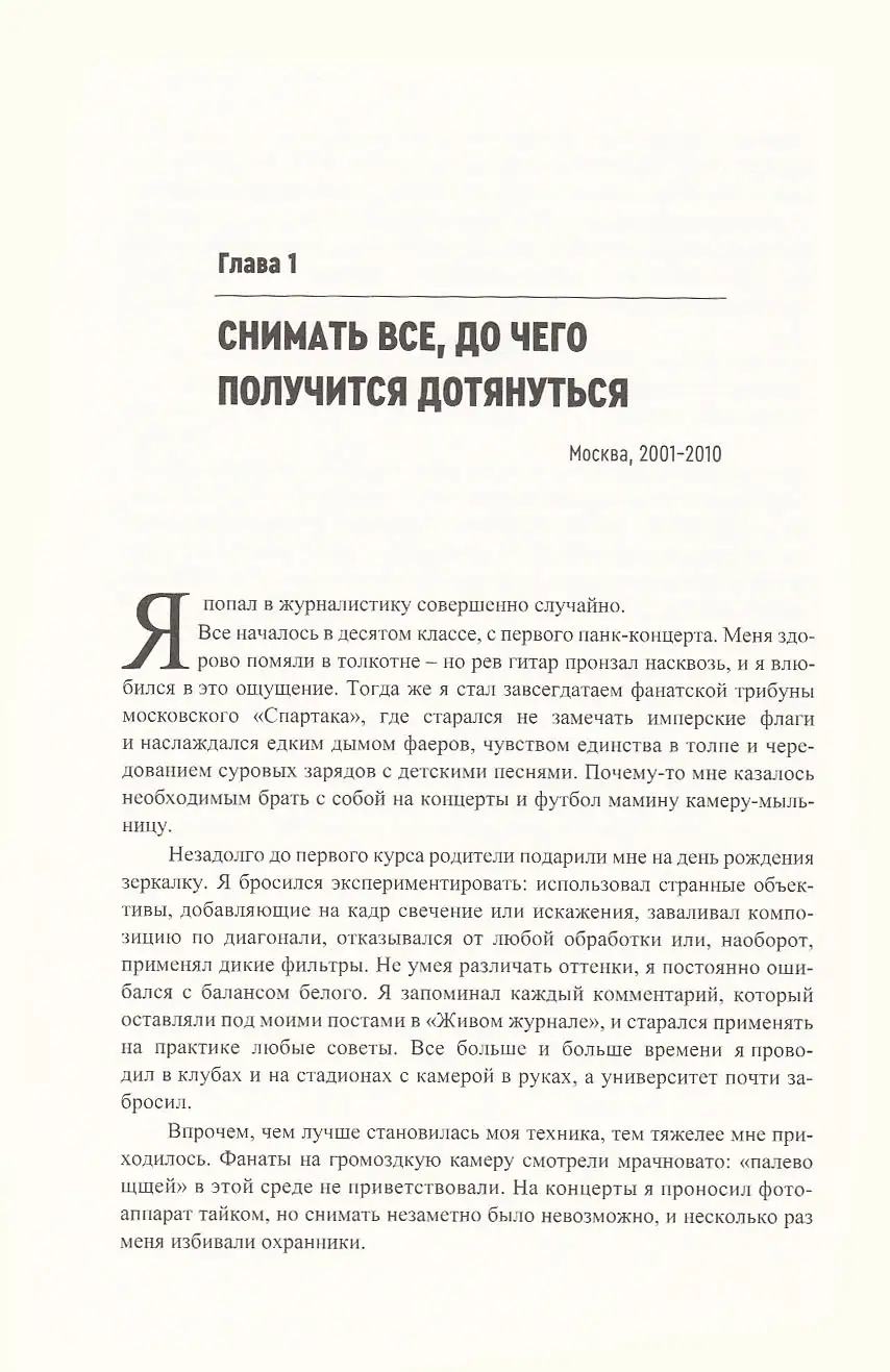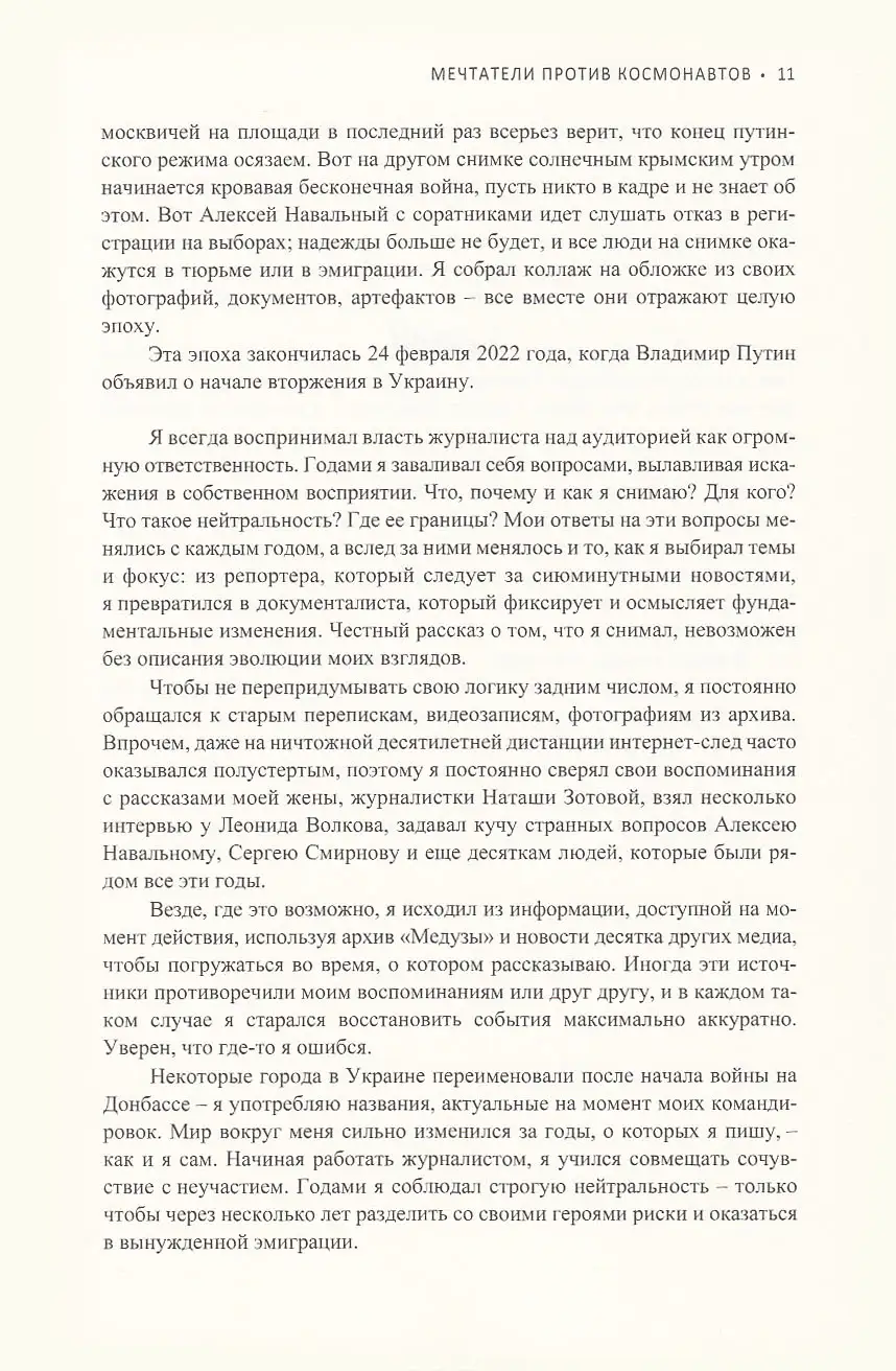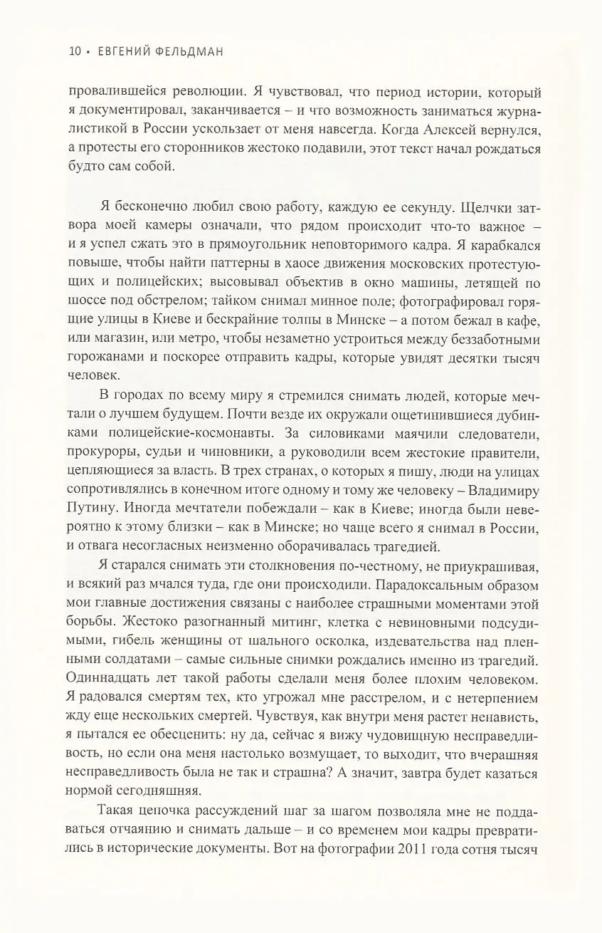 За несколько лет подросток, ходивший с «мыльницей» на панк-концерты, стал самым известным документалистом России — а страна пришла к жестоким репрессиям и полномасштабной войне. Чтобы честно показать основные этапы этого пути, Фельдман много раз рисковал жизнью и нарушал запреты. Поэтому книга, в которой он рассказывает о своей работе, читается одновременно и как трагедия, и как приключенческий роман.