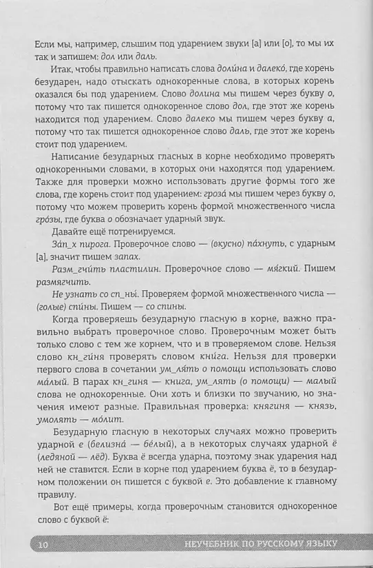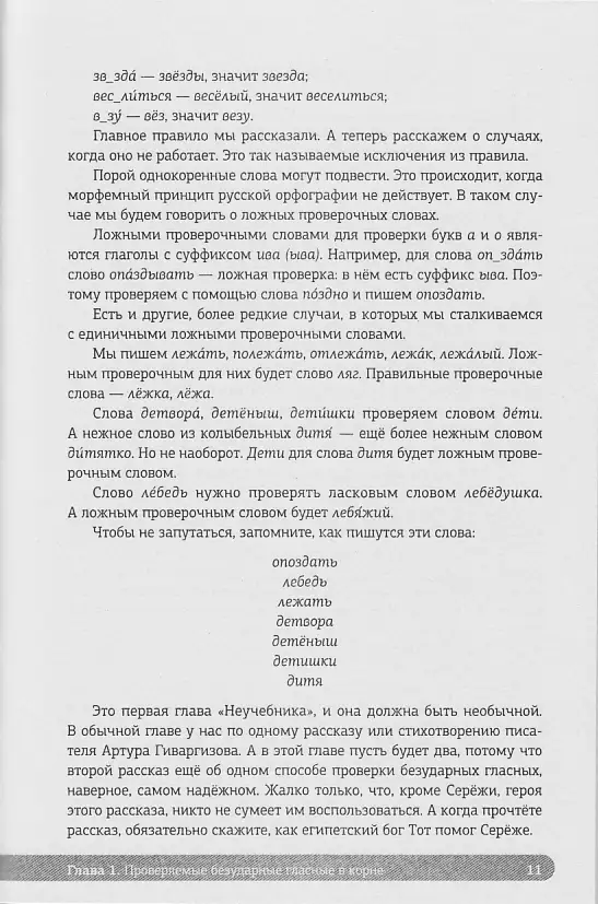 Каждая глава «Неучебника» посвящена одной орфографической проблеме, а открывает разговор о том или ином правиле уморительно смешной текст Артура Гиваргизова. Ребенок узнает, почему возникают правила и исключения из них, научится правильно писать — и все это без зубрежки, легко и весело. Что и говорить, «Неучебник» будет интересно почитать и взрослым — освежить школьные знания, а заодно и посмеяться. Несмотря на свою простоту и юмор, «Неучебник» — это полноценный сборник правил и упражнений, освоив которые школьник сможет уверенно писать без орфографических ошибок. В конце книги вы найдете орфографический словарик и ключи к упражнениям.