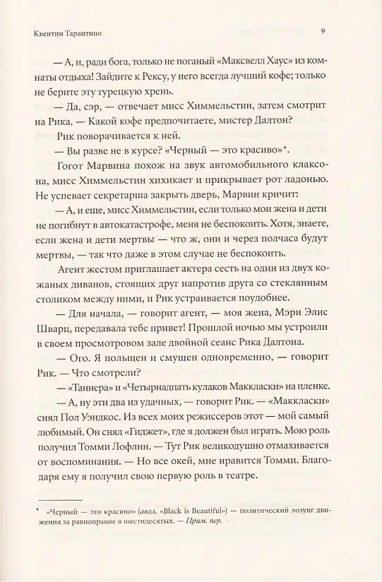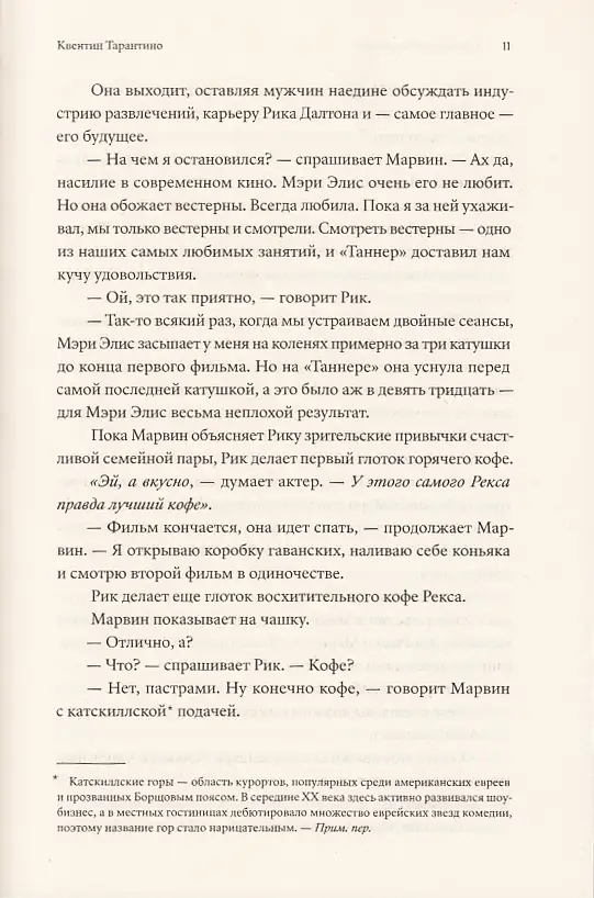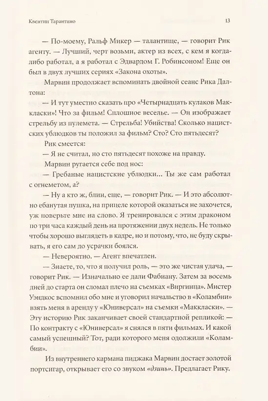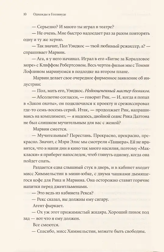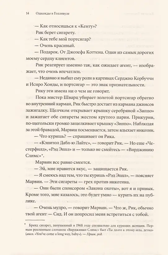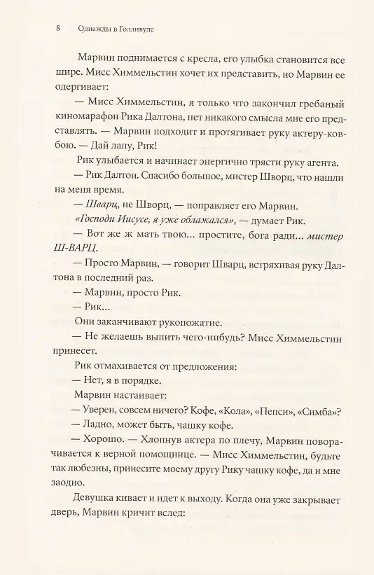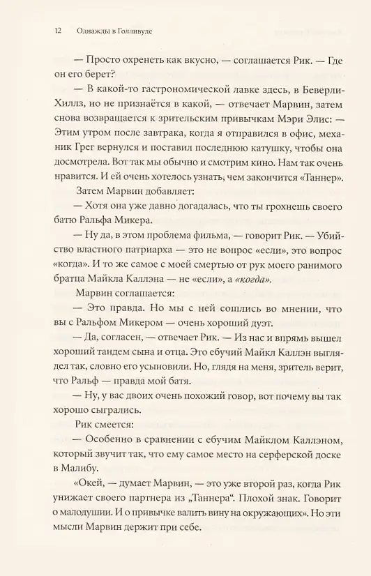 «Однажды в... Голливуде» ни на секунду не сбавляет оборотов даже в бумажной версии; книга читается запоем без помощи ДиКаприо, Брэда Питта и залитых жемчужным закатом панорам Лос-Анджелеса. Тарантино пишет, как говорит — быстро, не всегда чисто, с матюками, с завиральными отступлениями...