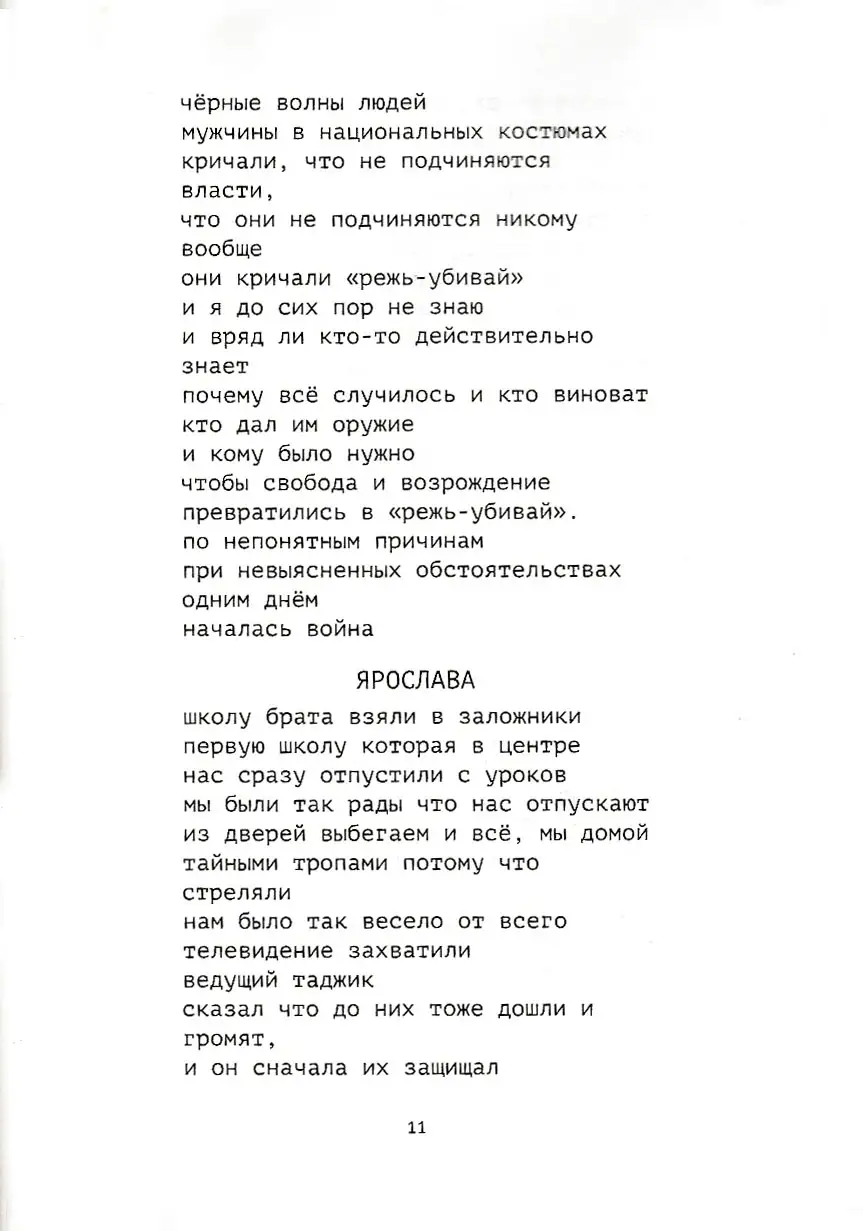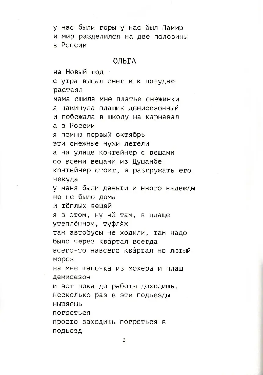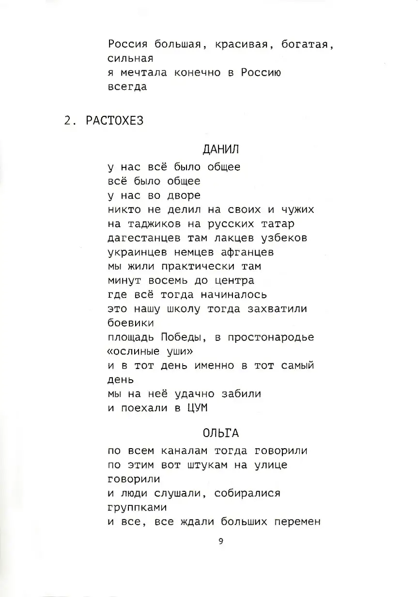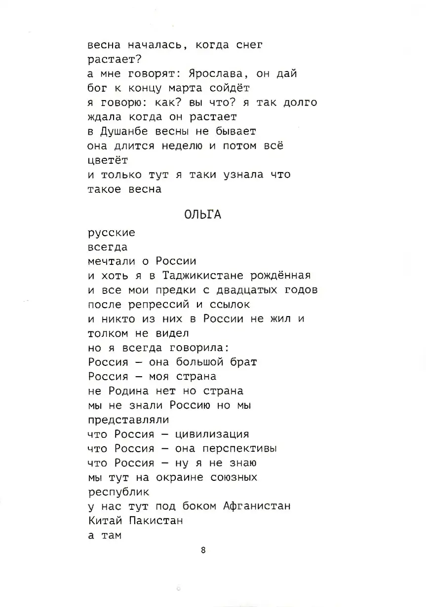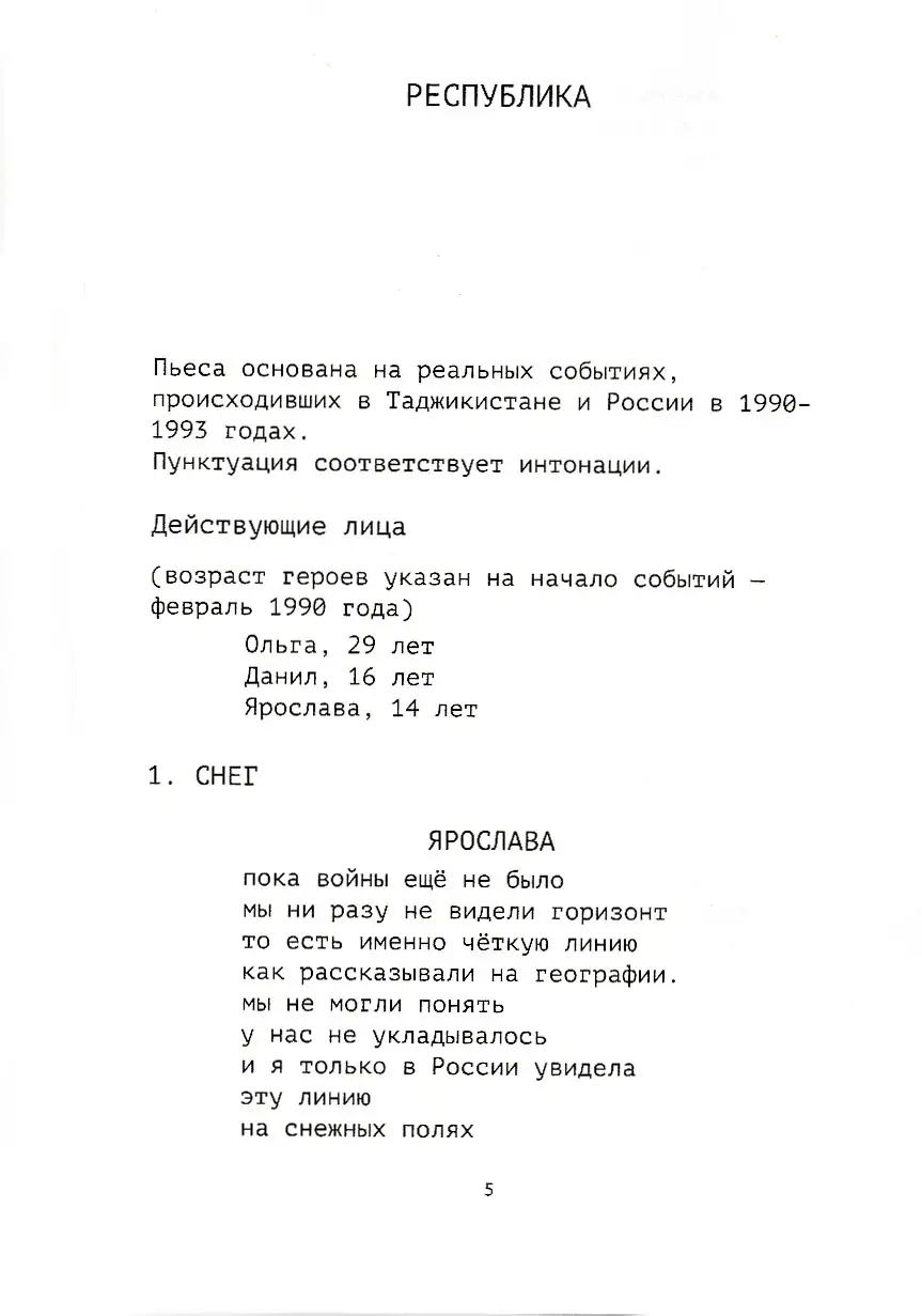 В сборник «Пять пьес о свободе» вошли истории, различающиеся по жанрам и форме. Это монопьесы «Коля против всех» и «Граница» (отмечена призом фестиваля антивоенных пьес «Эхо Любимовки» в Берлине). Постколониальная «Республика» повествует о русских жителях Таджикистана, бежавших в начале 90-х от гражданской войны. «Летсплей» и «Как сделать зомби в домашних условиях» — подростковый экшн, где сквозь шумный приключенческий антураж проступают истории любви и взросления. Объединяет все эти пьесы тема противостояния.