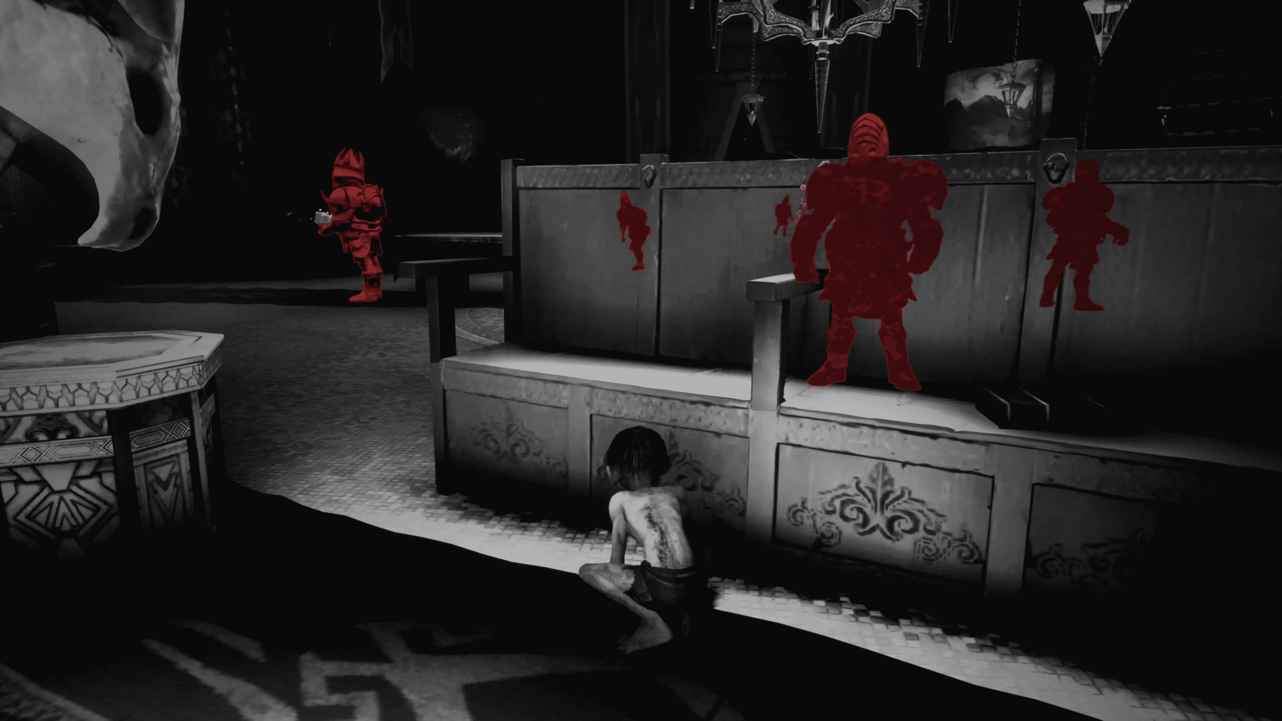 Далее Gollum делится на две примерно равные части. В первой герой рассказывает о годах, проведенных в тюрьме Мордора, и о своем отчаянном побеге оттуда. А во второй половине игры он пытается сбежать уже от эльфов Лихолесья, на которых потихоньку идут войной орки. Первая часть показывает Сердиземье с нового ракурса. Грязь, червивый хлеб, лавовые реки, издевательства, обман и неблагодарная работа до изнеможения. Голлум на себе познает тюремную рутину и порядки, потихоньку поднимаясь по «карьерной лестнице». Со временем он начинает работать глазами и ушами загадочного начальника тюрьмы и зарабатывает кое-какой авторитет. Игра использует двоякость героя. Довольно часто вам предоставляется моральный выбор — поступить в соответствии с мировоззрением Голлума или Смеагола. Чаще всего Голлум предлагает гадкие, подлые, но самые безопасные для него варианты. А Смеагол почти всегда хочет все решить миром и никого не обижать.