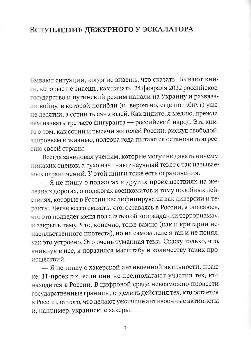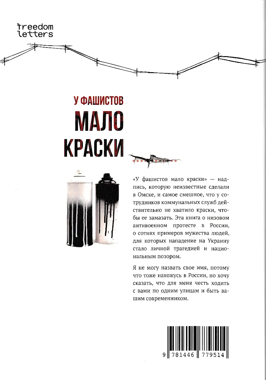 Автор этой книги, писатель, лауреат литературных премий (оставаясь в России, он не раскрывает свое имя), рассказывает об антивоенном сопротивлении через истории сотен людей. Одни выходили на пикеты, другие рисовали граффити и печатали листовки, третьи использовали «запрещенные цвета» в одежде…